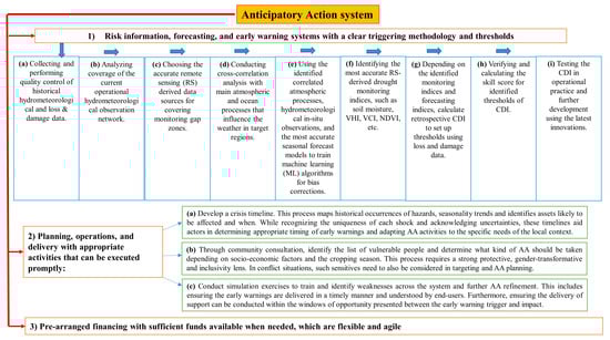 Crisis timelines serve as tools for untangling the complexities of slow-onset AA within disaster risk management (DRM) systems. They form the foundation of a phased approach by pinpointing AA windows and suitable interventions. These timelines enable stakeholders to understand how drought-related early warning systems and triggering can be coupled with actions to mitigate or articulate the impacts of the forecast event, thus providing an indication of the time required for the implementation of AA and, ultimately, the timeline of preparedness and response actions for slow-onset hazards [44]. An important initial step in the application of AA to slow-onset hazards involves analyzing how seasonal agricultural calendars align with particular natural hazards, including agricultural cycles and patterns of livestock movement. After this analysis, activities that are most beneficial during each cycle need to be determined for effective interventions [44].