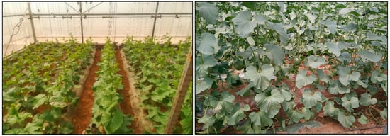 The plastic film was a white and transparent high-pressure, low-density polyethylene plastic film with a thickness of 0.014. The tested melon variety was Xizhoumi 25, which was grown on a hole tray substrate. Seed germination was carried out on 8 February 2021 and was sown on a 50-hole tray on 10 February. On 16 March, seedlings that had grown three leaves and one heart were planted in the greenhouse test ridges. The individual vines were pruned up to the 10th node, leaving one melon per plant. On 7 June, the plants were topped at the 20th node, and the fruits were harvested.