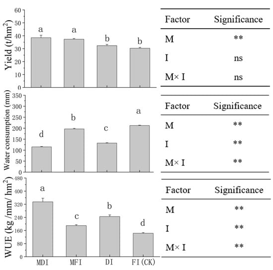 Yield, water consumption, and water use efficiency of melons under different treatments. Note: M, mulching; I, irrigation approach; different letters and ** both indicate significant differences among treatments at p ≤ 0.05; ns indicates no significant differences.