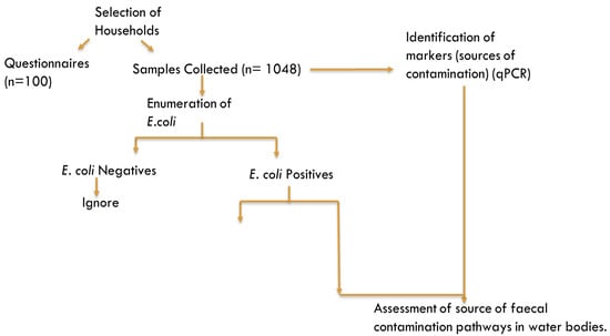 The current study was, therefore, conducted to track the sources of faecal pollutants from different water sources to the point of use using host-specific Bacteroidales qPCR assays. To achieve the aim of the study, two objectives were set: firstly, to identify faecal pollution of water sources by detecting and enumerating E. coli as a model FIB; and secondly, to identify the pathways of faecal pollution between the water source and the point of use by microbial source tracking methods.