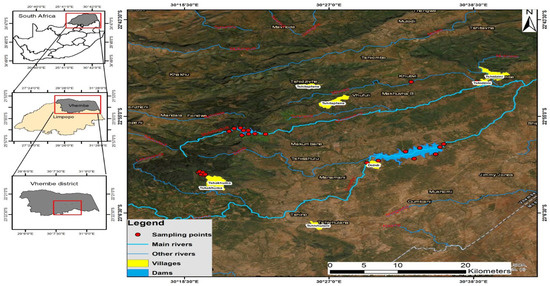 Limpopo Province is one of the poverty-stricken areas in South Africa and consists mainly of rural communities in which the majority of people are subsistence farmers. Human and animal activities in this area contribute greatly to the contamination of the rivers [23]. The Vhembe District Municipality is located in the Limpopo Province and comprises four (4) local municipalities, namely Thulamela, Makhado, Musina, and Collins Chabane. According to Stats SA, in 2016 [24] the total population of this district comprised 1,393,949 people, with a land area of 27,969,148 km2. The district experiences a large number of water outages with a substantial number of communities relying on unsafe surface water [25].