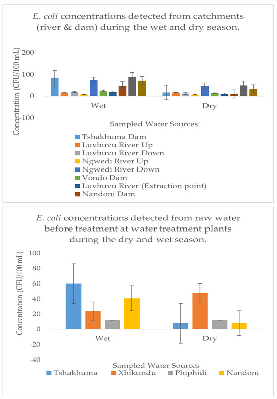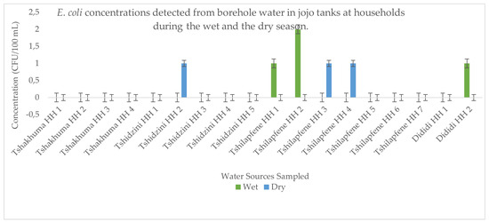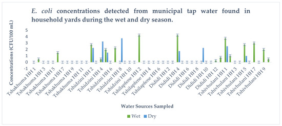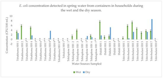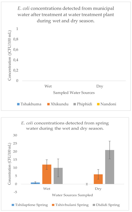 The identification of E. coli was employed in the present study as a model faecal indicator bacterium (FIB) aimed at assessing the faecal contamination of water sources in target areas. This bacterium serves as a better indicator in comparison with faecal coliforms. Fewer instances of false positives are reported to be experienced with this indicator [37]. Moreover, E. coli serves as an indicator of the microbial quality of the water and signals the presence of recent faecal contamination [38]. A substantial increase in E. coli concentrations during the rainy season has been illustrated in this current study (Table 2); this may be due to the surface runoff during storm events that can be considered as the classical source for the contamination of surface water bodies. Previous studies have also pointed out the relationship between E. coli concentrations and rainfall events. The assumption puts forward that the survival of E. coli in water bodies is influenced by water levels, moisture, and the availability of energy in these environmental habitats [39]. This clearly justifies higher concentrations of E. coli found in catchments (rivers and dams) during the wet season where the maximum recorded E. coli concentration was 90 CFU/100 mL, while a minimum E. coli concentration of 50 CFU/100 mL was observed during the dry season during the (Figure 4). Higher concentrations of E. coli were also recorded in the wet season ((85 CFU/100 mL) in the households utilising untreated river water, while a maximum concentration of only 34 CFU/100 mL was detected in the households utilising untreated river water in the dry season. Furthermore, the lowest concentrations (0 CFU/100 mL) were recorded in the municipal treated water in the households and river water in the households in the wet season (Figure 5). However, E. coli concentrations in the dry season may have been influenced by favourable temperatures during this season [40]. As observed in Figure 4, a higher maximum concentration was recorded in the dry season (21 CFU/100 mL) than in the wet season (10 CFU/100 mL) at the Dididi spring.