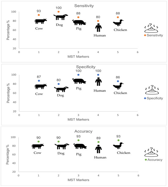 Perplexity may be experienced during the quantification of the markers using qPCR. To obtain reliable results, the assays must be optimised to achieve the utmost sensitivity, specificity, and accuracy [32]. The assay-tested amplification efficiencies ranged between 85% and 94%. The performance of the cow-associated assay (BacCow) was assessed with 15 cow faeces samples and the target marker was detected in 93% of the samples (14/15). High specificity was obtained for Pig-2-Bac and HF183 (100%) while the lowest specificity was recorded for BacCan (80%). The HF183 marker was the least accurate (89%) compared to animal markers as illustrated in Figure 10. Table 3. illustrates the validation standard curve performance of host-specific Bacteroides markers (BacCow, Cytb, HF183, Pig-2-Bac, BacCan) using standard serial dilutions of a plasmid DNA with known concentration.
