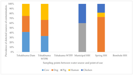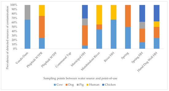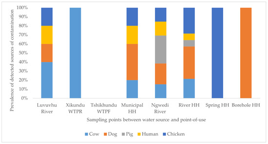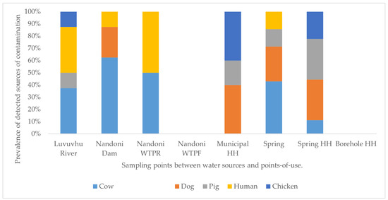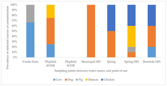 Vigorous agricultural practices predominantly existing in the rural areas of developing countries may have a detrimental impact on the quality of both groundwater and surface water, and South Africa is not an exception [33]. The contamination of water sources as a result of agricultural activities due to the use of fertilisers has also been reported by previous investigators in the Vhembe District Municipality and this may have a negative impact on the quality of water supplies [34,35]. Although agriculture contributes to the income of rural communities for their survival, it has been observed in India, through microbial source tracking methods, that the faecal contamination of domestic water sources by animals is more prevalent than human contamination [36]. By using these methods in this study, it was possible to track the sources of faecal contamination from the various water sources (river, dam, spring, and hand-dug well) to treated water and/or the household level.