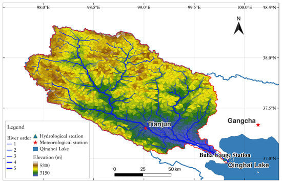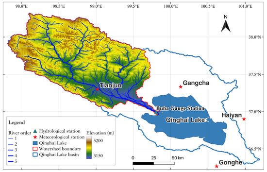 The Qinghai Lake Basin is located in the northeastern part of the Tibetan Plateau, with coordinates between 97°50′ E and 101°20′ E, and 36°15′ N and 38°20′ N. It is a sensitive area to global climatic change and a region with vulnerable ecosystems. The basin exhibits strong catchment capabilities, predominantly featuring high-altitude areas ranging from 3194 to 5174 m, with terrain that decreases from the northwest to the southeast []. The Buha River, an important tributary in the basin, flows through Tianjun, Gangcha, and Gonghe Counties, originating from the Shule-Nanshan mountains in the northwest and flowing southeast to Qinghai Lake, covering approximately 286 km. The altitudes of the river source and mouth are about 4513 and 3195 m, respectively, and the watershed area is 1438 km2.