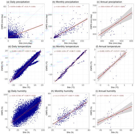 Comparison of meteorological data from the Gangcha meteorological station (x-axis) and CMFD grid data (y-axis) on daily, monthly, and annual scales, with the gray shadows representing 95% confidence intervals.