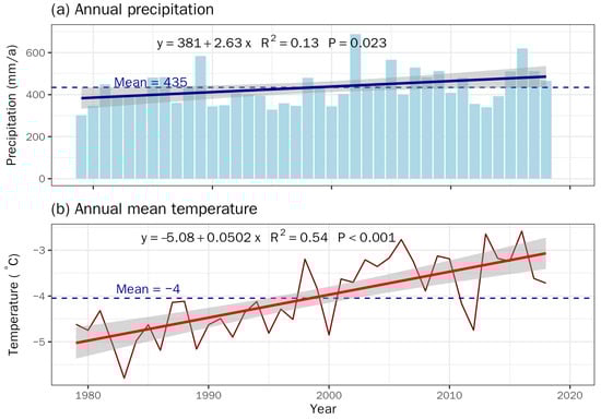 The historical mean annual precipitation and temperature fluctuation trends in the Buha River watershed, based on CMFD data, show that the annual average precipitation is approximately 435 mm (Figure 4). Despite considerable inter-annual fluctuations, an overall gradual increasing trend is observed, with a growth rate of about 2.63 mm/year (R2 = 0.13, p < 0.05). Over 40 years, the mean annual temperature is around −4 °C, albeit with significant rising trends, at a warming rate of roughly 0.05 °C/year (R2 = 0.54, p < 0.005). Although, over the past 40 years, the increase in the precipitation level of the Buha River watershed is modest, the temperature consistently rises. This progressive increase in precipitation and temperature potentially impacts the local water cycle processes.