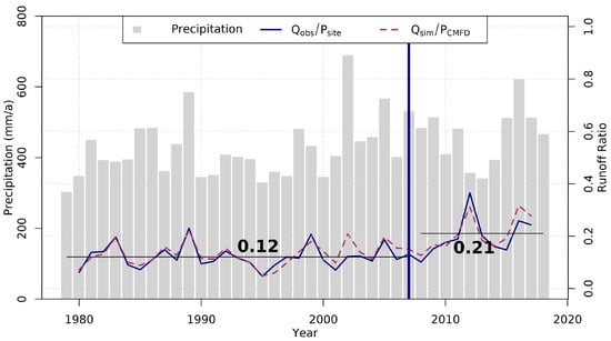 Comparison of the annual precipitation time distribution from CMFD, with calculated runoff ratios using observed streamflow data versus precipitation data from both CMFD and Tianjun meteorological station.
