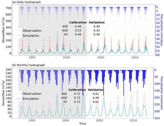 A demonstration of the SHUD model’s performance during the calibration period (1993–2002, shadowed period) and validation period (2003–2011) in simulating the Buha River streamflow: (a) daily scale; (b) monthly scale.