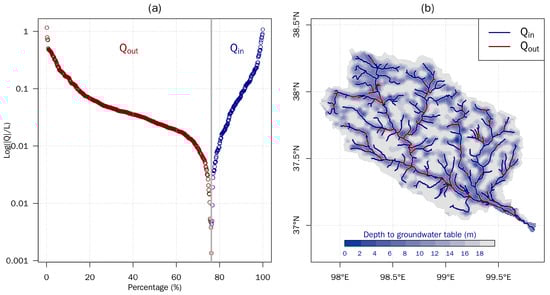 The distribution of leaks and replenishment areas in the Buha River network. (a) Baseflow rate per unit length of all river sections; (b) Groundwater depth and the segments of river leakage/replenishment.