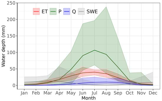 The long-term water balance equation for the Buha River watershed is articulated as , where P is the total precipitation, E is the actual ET, and Q is the streamflow in the statistical period. The E and Q are results from the SHUD simulation. Seasonal variations in the water balance are substantial within this region, as illustrated in Figure 8. This is mainly attributed to the unique climatic characteristic of the Buha River watershed, namely, the concurrency of high temperatures and monsoons causes the precipitation, evaporation, and streamflow to peak during the summertime. Figure 8 provides a detailed depiction of multi-year monthly averages of precipitation, streamflow, actual ET, and snowfall, alongside their maximum and minimum values. Precipitation predominantly occurs from May to October (92% of annual precipitation), with a higher proportion of snowfall in November and May of the following year, while streamflow is mainly concentrated from May to September (89% of annual streamflow). Annually, rainfall displays considerable fluctuations, as well as snowfall, indicating significant unpredictability in the region’s precipitation pattern.