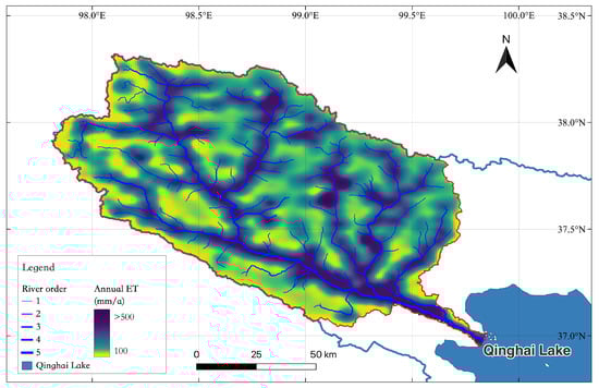 The variability in actual ET is influenced by multiple factors, primarily the availability of energy and soil water. In the Buha River watershed, areas closer to the river experience higher soil humidity due to elevated groundwater levels, consequently resulting in relatively high actual ET (see Figure 9). The spatial disparity in actual ET is mainly determined by soil water content, while the physical properties of the soil and vegetation cover significantly affect the ET process. Additionally, topographic features, such as slope and orientation, influence the surface’s energy absorption and the evaporative capability of water, indirectly impacting the spatial distribution of actual ET.