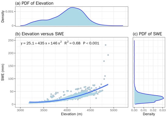 Snow water equivalent (SWE) accumulation intensifies with increased elevation (b) with the gray shadow behind the regression line representing 99% confidence intervals, in addition to the possibility distribution function (PDF) of the elevation (a) and the SWE (c).