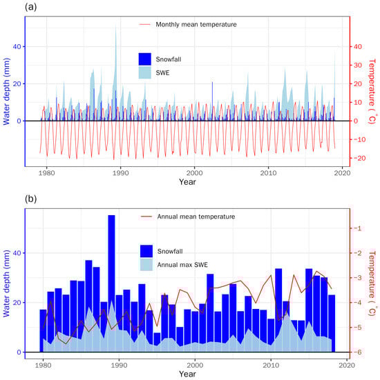 Depicts the monthly (a) and annual (b) variations in the Buha River’s snowpack from 1979 to 2018, based on the output of the SHUD model.