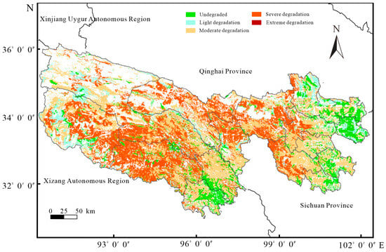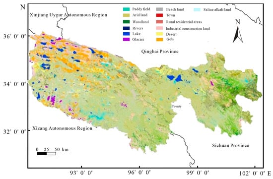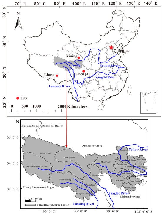 The Three Rivers Source area is located in the southern part of Qinghai Province, China, and lies within 31°39′–36°12′ N latitudes and 89°45′–102°23′ E longitudes (Figure 1). Located in the hinterland of the Qinghai–Tibet Plateau, it is the source of the Yangtze River, Lancang River, and Yellow River, and includes 4 autonomous prefectures and 16 counties, with a total area of 3.0 × 105 m2. The distribution of land use in the Three Rivers Source area is shown in Figure 2. The average altitude is 3500–4800 m, and the terrain is complex and variable. The climate conditions are poor and the wind speed is high. The average annual rainfall is 300–400 mm, and the rainfall is concentrated and mostly rainstorms, which belongs to the typical plateau continental climate. The soil is mainly formed from loess and sediment, with poor resistance to wind erosion. Grassland degradation is severe, with low soil and water conservation capacities.