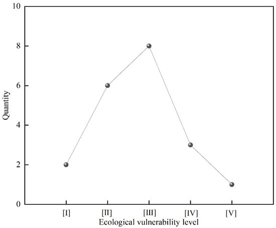 Judging from the weight distribution and comprehensive evaluation results of ecological vulnerability assessment indicators, the weight of area reduction is as high as 23.4%, which has become the biggest threat factor affecting ecological vulnerability. This is because area reduction refers to the area occupied by human activities, human engineering and construction activities in the original vegetation area, breaking the ecological balance [,]. In addition, existing studies have proven that it is difficult to restore the original ecology through the self-regulation of the ecological environment, and artificial intervention should be carried out []. The degradation degree of potential vegetation integrity has a weight of 12.3%, which is the factor with the least impact on ecological vulnerability and has a relatively low impact on ecological vulnerability. In the assessment of factors affecting the reduction in ecosystem area, the vast majority of the reduction in ecosystem area occurs in industrial construction areas. The increase in human construction activities directly endangers the growth space of vegetation in the ecological environment. The reduction in the area of ecosystems located in industrial construction areas accounts for 80.3% of the total reduction in ecosystem area, indicating that there is a close relationship between the reduction in ecosystem area and land use patterns (Figure 3 for ecosystem area degradation). Industrial construction in the Three Rivers Source region should avoid areas with poor ecological vulnerability. Changes in topography and landforms are the second largest vulnerability assessment factor after area reduction, with a weight of 18.5%. This is because changes in topography and landforms can directly interfere with the ecological environment, affect vegetation development, simplify vegetation structure, and reduce quality, thereby further reducing ecological area []. According to the assessment results, changes in soil environment and trampling will directly lead to the compression of vegetation growth space. Secondly, trampling leads to the reduction and disappearance of soil pores, the deterioration of soil permeability and infiltration, and further leads to the decline of the environmental quality of plant habitats, posing a threat to the sustainability of the ecological environment []. Due to frequent human activities, most ecological environments are subject to trampling, resulting in a decline in the quality of their growth environment. In addition, the disappearance of existing vegetation seed banks and the invasion of exotic plant species are also important factors that hinder and affect tree growth and vegetation restoration, leading to secondary degradation of the ecological environment [,]. At the same time, the Analytic Hierarchy Process, indicator layers, and items selection also have their limitations, including the subjectivity of experts. It is also unrealistic to fully cover all indicators of ecological vulnerability in the indicator layer and items selection. However, we selected nine experienced experts in the field of ecological environment to rate the questionnaire in order to minimize the influence of subjective evaluation results from the experts. Meanwhile, the literature has shown that the Analytic Hierarchy Process (AHP), the indicator layers selected in this paper, and the items used for environmental vulnerability assessment are feasible and efficient [,]. In the ecological vulnerability assessment of 20 locations in the study area, the average value of ecosystem vulnerability caused by six factors was 46.31 points. Figure 4 shows the distribution map of ecological vulnerability levels for the 20 locations. According to Figure 5, there is one location with an extremely vulnerable ecological environment, which is at level V and requires an emergency plan to overcome ecological vulnerability. There are three locations with sustainable ecological environment vulnerability at level IV. There are two locations with vulnerability level I, which are less disturbed by biological and non-biological factors. There are six locations with vulnerability level II, which do not require excessive intervention. There are eight locations with vulnerability level III, which can be managed to maintain the sustainability of the ecosystem.