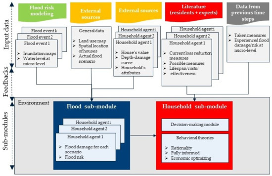 Consequently, new modeling approaches are needed to overcome the limitations of current flood modeling techniques and to allow the study and inclusion of human behaviors and social processes in connection with flood risk analysis and in the face of climate change. In particular, new techniques should enable us to perform modeling and assessment of current and future flood risk at the micro-level and, more specifically, at the household-level. To embed human behaviors in the simulating environment, social simulation techniques have been promoted in recent decades, applying computational methods to study and model social processes [8]. According to Nabinejad and Schüttrumpf [9], agent-based modeling (ABM) is an innovative social simulation technique appropriate for integrating dynamic adaptive individual behaviors into flood risk analysis.