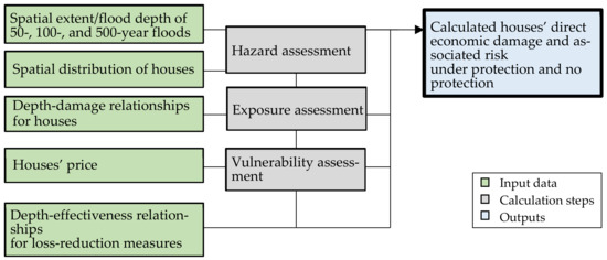 The temporal modeling framework for establishing micro-scale flood risk analysis is based on the joint assessment of flood hazard, the degree of exposure of houses, and house vulnerabilities to the particular hazard. To achieve the goals, the flood exposure and inundation depth of each house were calculated in each time step under probable flood scenarios. In this regard, a series of the spatial extent of flood scenarios and spatial distribution of houses were linked on a per-cell basis. Next, depth–damage curves of houses, depth–effectiveness curves of flood-loss-reduction measures, and house values were fed into the module to compute the flood losses of each house based on the decision of the households to adopt flood-loss-reduction measures. The flood sub-module was enriched with a climate change scenario through the water-depth rise parameter to adjust the initial flood depths over time due to climate change. Figure 2 depicts the input data, calculation steps, and outputs of the established flood sub-module in ABMhofo.
