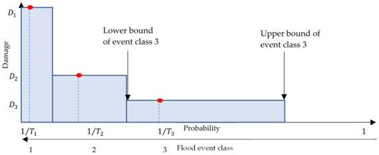 In ABMhofo, a discrete set of probable flood events constitutes flood scenarios, based on which the probability–damage curve is generated. To derive the occurrence probability of the given flood events, several event classes were defined. Next, the occurrence probability of each class was computed as the difference between the upper bound and lower bound likelihood based on the following assumptions: (1) the damage is constant for the floods belonging to that event class and is equal to the damage of the given flooding belonging to that class; (2) the damage is zero for the events with the exceedance probability higher than the last class; and (3) the associated damage of less frequent flooding is equal to that in the first class. Figure 3 illustrates a probability–damage curve for three flood events as an example.