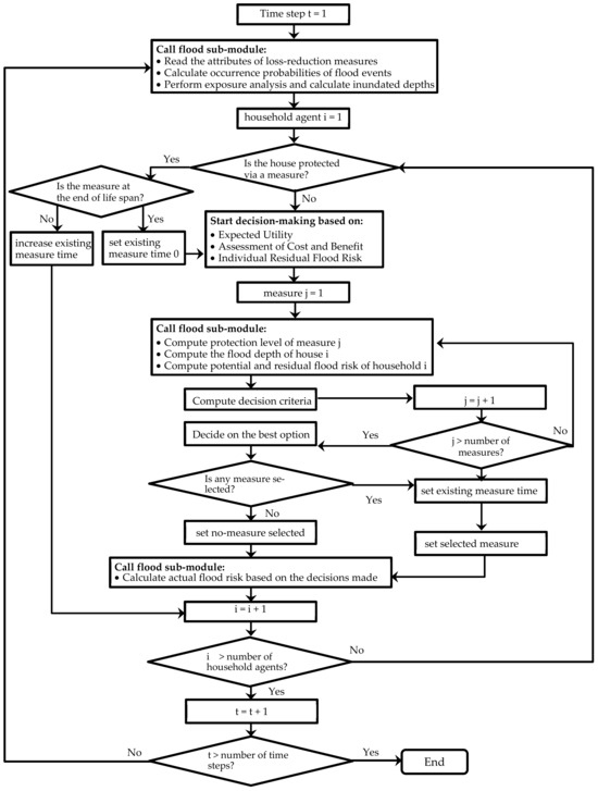 Within each time step, a sequence of activities takes place, guiding household agents as they decide on the adoption of flood-loss-reduction measures. Household agents update their knowledge about their flood risk, market prices, climate, and flood characteristics. They gain information from personal experiences, the physical environment, and publicly available data. The flood risk and flood vulnerability of houses play a major role in their decision-making. Individual flood risk is calculated within the flood sub-module at each time step. Each household agent evaluates the possible private-loss-reduction measures and assesses their flood vulnerability. At the end of the year, each agent decides on the best option according to their preferences over risk. In this regard, three separate decision-making frameworks were defined and embedded in the module. When the decision-making of all household agents is completed, it marks the end of that time step. At this point, the decisions of household agents are fed back into the flood sub-module to evaluate the resulting flood risk of decisions made for the following year.