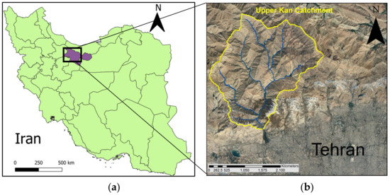 The developed model is applied to the upper Kan catchment, located in Tehran province (Iran) between 51.950 and 51.374 east longitude and 35.950 and 35.775 north latitude with an area of approximately 200 . Kan River is the main stream of the catchment, which navigates to Kan village and finally flows into the downstream section of Kan catchment. Kan River catchment is a typical case in Iran with arid and semi-arid conditions where precipitation is rare and serious droughts occur frequently. However, the region has also been exposed to severe flooding in the last four decades leading to 3000 causalities and more than USD 30 million in damage [7]. In 2015 alone, a giant flood resulted in USD 10 million in damage to residential, commercial, and agricultural areas showing high flood risk there [34]. FRM strategies of the basin have failed in the past because of the low flood risk awareness of the residents and the lack of public involvement in FRM [7]. Due to these reasons, this region has been selected as the study area (Figure 5), where its flood risk assessment and management need to include private-loss-reduction measures.