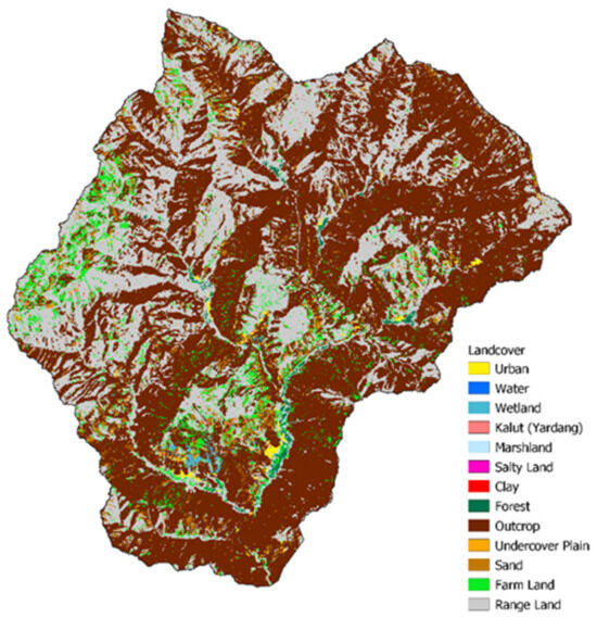 Topographical and land use data: Topographical data of the area were obtained through the TanDEMX 12 m Digital Elevation Model (DEM) and imported into the model with a cell size of 50 m. The land use map of the study area was achieved through the Google Earth engine. It includes 13 classes (urban, water, wetland, kalut, marshland, salty land, clay, forest, outcrop, uncovered plain, sand, farmland, and range land) with a 10 m by 10 m resolution (Figure 6).