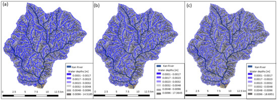 Spatially distributed water level and flood depths in upper Kan catchment under current climate for the: (a) 50-year, (b) 100-year, and (c) 500-year flood events.