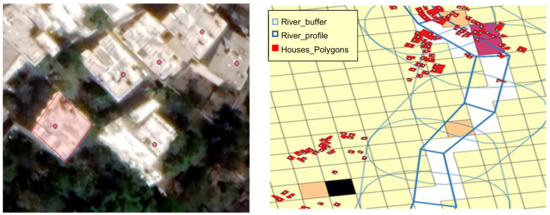 Housing data: House shape files and their geometric data were not freely available for the upper catchment of Kan. To specify the houses, both Google satellite images and the land use map of the area were used, through which shapefiles of houses were generated and the geometric features were calculated. In total, the generated shapefiles included 175 houses in the desired area, and hence, a population of 175 possible flood-prone households were the central decision-makers in the model. Figure 8 depicts the extraction of housing data based on Google satellite images.