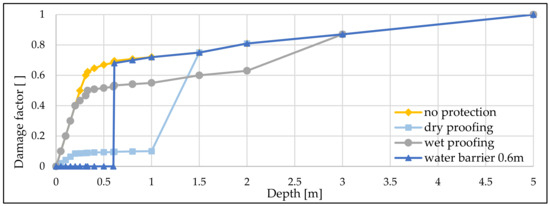 As these measures have not been used either by the residents or in the country, no on-site data were available about their lifespan, cost, and effectiveness. Therefore, the desired information was extracted from the FEMA Policy Standards [38] with an adjustment in the lifespans to take into account the conditions of the study area (Table 2). The effectiveness of flood-loss-reduction measures is not constant and depends on the flood depth. Therefore, it is best explained through the depth–effectiveness curves illustrated in Figure 9. Due to the lack of data, only damage to houses was explored, and damage to contents was not investigated.