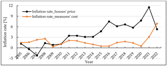 Inflation rate: Due to the lack of inflation rate data for the study area, α was considered as the mean value of the inflation rate in Germany from 2005 to 2022, equaling 1.7% and 3.9% for the loss-reduction measure costs and house prices, respectively. Figure 10 shows the time series of the inflation rate in Germany for measures and houses from 2005 to 2022 [39]. Table 3 summarizes the required data set of the study area.