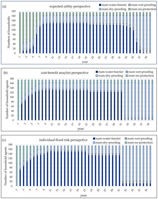 Figure 11 illustrates the contribution of the household agents in adopting flood risk mitigation measures over time under the three behavioral frameworks. The results show a similar pattern among the three perspectives, while the level of preparedness is increasing over time. It can be observed that the percentage of houses with no protection measures is significantly reduced over time from 100% to 7% under the expected utility perspective, and cost–benefit analysis perspective. The findings indicate that wet floodproofing is the least common private-loss-reduction measure over time under all three perspectives and on average, only 4% of the population chose wet floodproofing. The most considered measure among the household agents changes from water barriers to dry floodproofing in the 30th simulation year. This arises from the difference in the highest efficiency level of the measures in different depth ranges. That is, a water barrier leads to 100% damage reduction but only for flood depths under 0.6 m, while dry floodproofing shows its highest effectiveness for flood depths between 0.6 m and 1 m (see Figure 9). In comparison to the two other perspectives, the decision-making based on the individual flood risk leads to the 100% engagement of the household agents in undertaking private-risk-reduction measures over time (Figure 11a). The findings show that adopting flood risk mitigation strategies is coupled with the level of preparedness, which is in line with the observations of Rözer et al. [40] and Bubeck et al. [41].