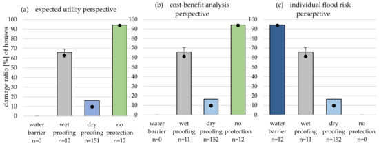 A closer look at Figure 12 shows that only through the individual flood risk perspective has 100% of the population engaged in the adoption of private-loss-reduction measures (Figure 12c). This is also in accordance with the results in Figure 11. In contrast with the two other behavioral perspectives, decision-making under the flood risk perspective has caused 7% of the household agents to implement water barriers leading to a 94% damage ratio on average. This observation emphasizes the impacts of different decision-making perspectives on the amount of damage reduction.