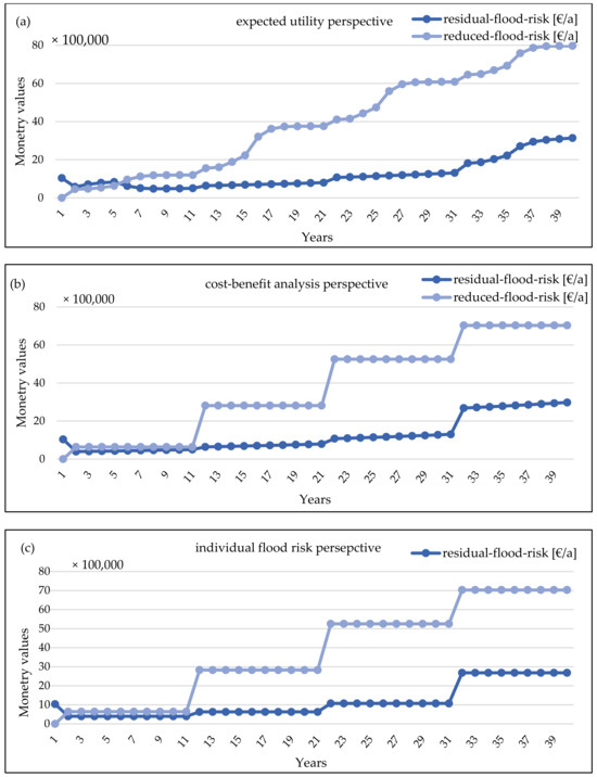 Figure 13 illustrates the macro-level impacts of household adaptive rational behaviors on the residual and reduced flood risk of the whole area over time under the three frameworks. The figure highlights the linkage between household flood vulnerabilities at the micro- and macro-levels. It can be seen that the flood risk of the whole area is reduced more over the years if the household agents make their decision based on the expected utility perspective (max EUR 8,000,000/a). Though there is a slight difference in the residual and reduced flood risk between the two other perspectives, the pattern of the temporal change is very similar. The results illustrate the importance of presenting real-world micro-level behaviors in flood models to explore their impacts on flood risk at the macro-level. These findings are consistent with the previous studies [41,42].