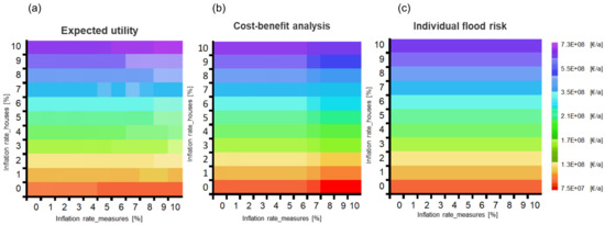 The analyses related to the cost–benefit analysis perspective (Figure 14b) reveal that the inflation rate in measure costs starts to impact the aggregated residual flood risk positively at 6%. The results related to the expected utility perspective (Figure 14a) show more complexities as the aggregated residual flood risk changes differently under various combinations of the inflation rate for measure costs and that of the house values. The greatest reduction in the residual flood risk of the whole area is achieved under the expected utility framework through the inflation rate of 10% and 1% for the measure costs and house values, respectively. In contrast to the two other behavioral perspectives, the adoption of private loss mitigation measures under expected utility is influenced by the inflation in both measure costs and house values.