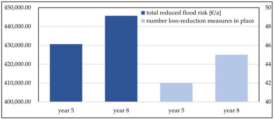 Total reduced flood risk of the population as well as the number of measures in place for simulation year 5 and year 8.
