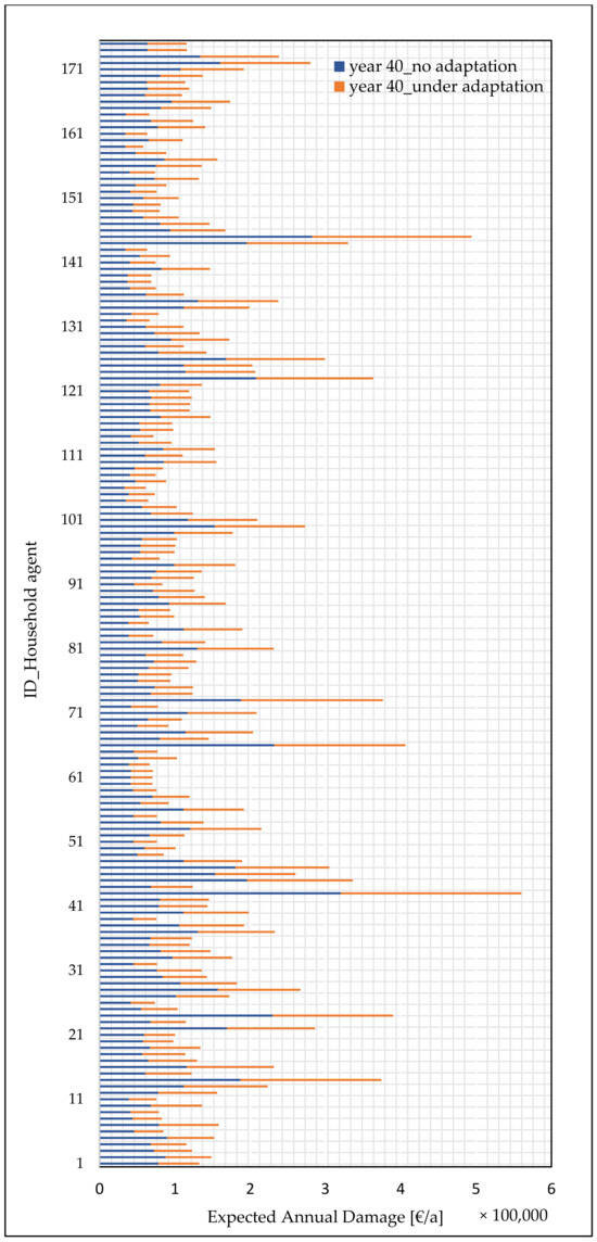 Figure 16 illustrates the computed flood risk in the 40th simulation year at the micro (household)-level under climate change when the household agents take loss-reduction measures and when they do nothing. It can be seen that taking loss-reduction measures can significantly decrease flood risk at the household-level, which is in agreement with the research by Sairam et al. [44]. The figure shows that the flood risk of some household agents decreases by 45% after taking private flood mitigation measures. Such a significant reduction in expected damage to the household agents indicates that effective flood adaptation is achievable even in the face of climate change.