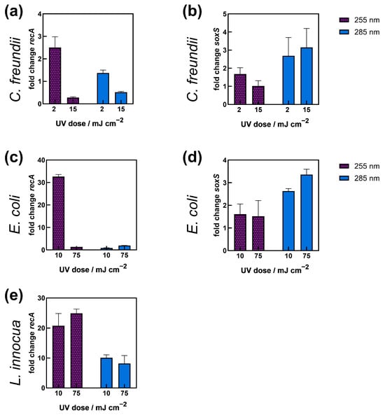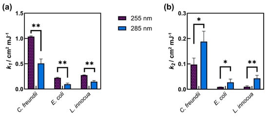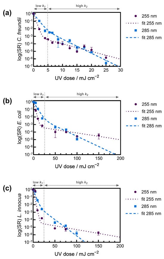 ; irradiation of the different bacteria with ultraviolet light at varying wavelengths (255 vs. 285 nm) and doses