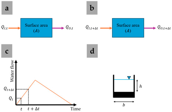Components of a system: (a) relationship between and at time ; (b) relationship between and at time ; (c) water flow hydrograph; and (d) rectangular weir.