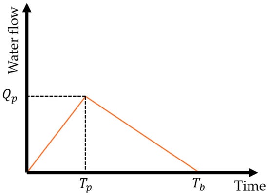 The direct runoff volume of the triangular hydrograph can be determined by evaluating the excess rainfall () over a watershed with a drainage area . Subsequently, the peak flow can be expressed as follows: