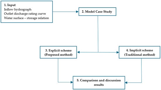 The objective of this research is to develop an Explicit Water Level Pool Method (EWLPM) for reservoir routing, which can be used as a new approach for practical applications. The proposed methodology consists of five steps, as illustrated in Figure 3.