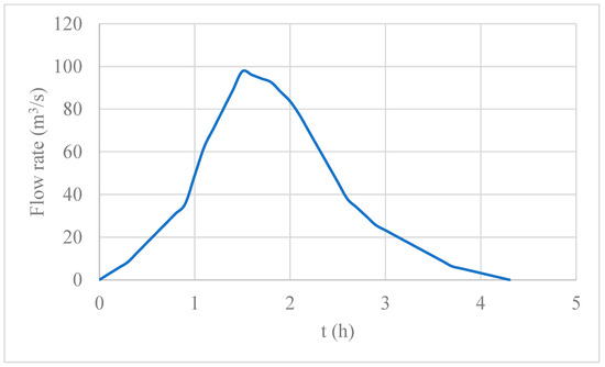 The selected rainfall intensities ranged from 82.5 to 125.9 mm/h for the four sub-basins of the case study, considering a return period of 100 years. The outflow hydrograph was computed for a 100-year return period, which was determined at the entrance of the reservoir in the project’s technical report [28]. Figure 5 shows the results of the inflow hydrograph. The peak flow is 97.72 m3/s, which occurs at 1.5 h. The base time of the inflow hydrograph is 4.3 h.