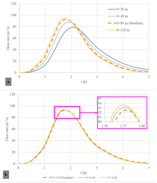 A sensitivity analysis was conducted to ascertain the influence of weir width () and discharge coefficient () when the proposed model is applied. The variation in parameters is shown in Table 1, while the obtained results of the outflow hydrograph are presented in Figure 7.
