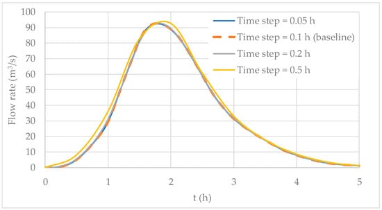 The time step ranged from 0.05 to 0.5 h; the results are depicted in Figure 8. A linear interpolation was used to compute the inflow hydrograph, adjusting for the varying time steps, as shown in Figure 4. This interpolation method was also applied to calculate the outflow hydrograph, ensuring consistency in the time step used for computations. Most simulations tend to produce a similar outflow hydrograph in comparison to the baseline simulation. The worst results were obtained using a time step of 0.5 h, as this represents a high time step in comparison to the values of the inflow hydrograph. This is of utmost importance since time steps should be suitably selected. However, the peak flow for a time step of 0.5 h was 92.53 m3/s (occurring at 2 h), which can be compared to the peak flow reached in the baseline simulation of 92.58 m3/s (occurring at 1.8 h). This robust performance of the proposed model confirms its potential impact in the field of hydrological modeling.
