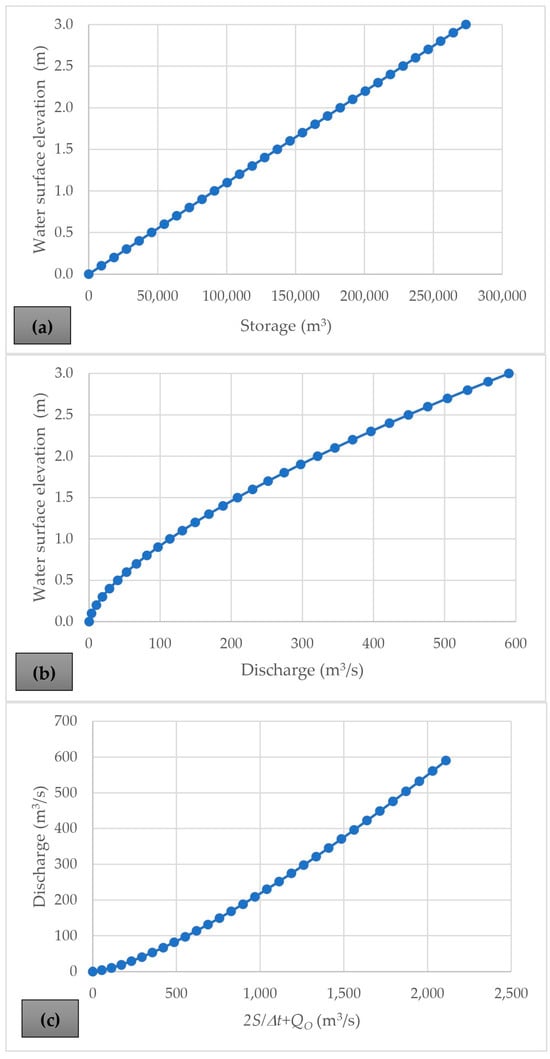 Applying IWLPM requires computing the water-surface-elevation–storage relation, the weir discharge rating curve, and the storage–outflow function. These were calculated using the data for the baseline problem (see Section 4). The results are presented in Figure 9.