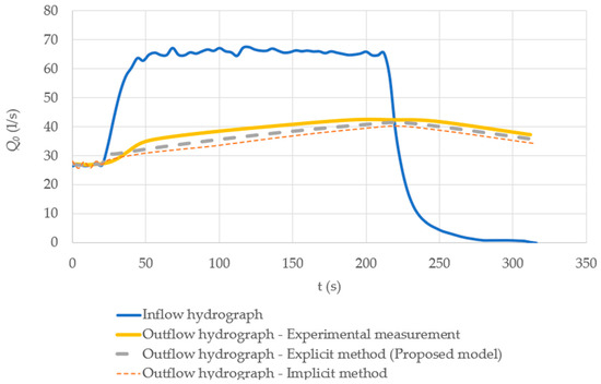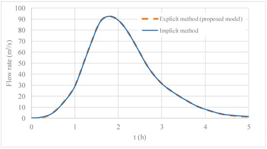 Comparison of the outflow hydrograph considering the explicit (proposed model) and implicit methods for water level pool routing.