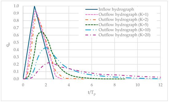 Representation of the triangular unit inflow hydrograph and outflow hydrographs as a function of the parameter .
