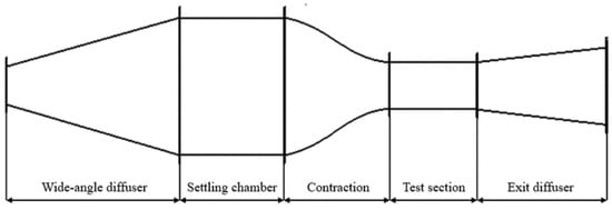 To ensure a stable wind speed during the process of freezing, it was necessary to control the wind speed using a wind tunnel in the laboratory. Considering manufacturing costs and spatial constraints, the wind tunnel was designed as an open-circuit low-speed wind tunnel, with its structure shown in Figure 1.