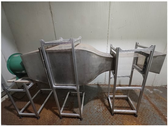 As for the wind tunnel in this study, the settling chamber and contraction section were processed as a whole, and the remaining sections were processed separately. For observation purposes, acrylic material was selected for the test section, and the remaining parts were made of stainless-steel plates. The contraction ratio was set to 7 and the maximum wind speed was 10 m/s. A wind tunnel device with a total length of 1425 mm was finally obtained. All sections were connected by flanges and nuts, as shown in Figure 2.