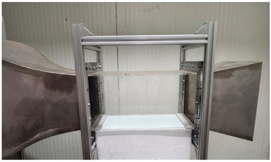 To mitigate the interference caused by salt and impurities within the ice, distilled water ice was chosen as the research subject. The foam box had the characteristics of low thermal conductivity, good thermal insulation, strong plasticity, and low cost, so it was used for condensation chambers. The combination of a condensation chamber and wind tunnel is shown in Figure 3. The ice formation process was conducted in a low-temperature laboratory where the temperature can be adjusted to as low as −40 °C, with a temperature control precision of 0.1 °C. To ignore the potential influence of growth temperature on ice strength, the freezing temperature was uniformly set to −30 °C, while the experimental temperature was uniformly set to −10 °C.