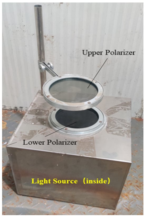 The ice crystal structure was observed through thin ice sheets attached to glass sheets. These sections were produced in the low-temperature laboratory. Ice samples were cut into sections with a side length of 5 cm and a thickness of 1 cm at different positions and divided into horizontal and vertical ice crystal measurements. The sections were attached to glass sheets slightly above 0 °C. After standing for 24 h in a low-temperature environment, the sections were thinned to less than 1 mm using a planer to facilitate clear observation of the ice crystal boundaries. The prepared sections were labeled with their information and stored in clean, sealed plastic bags. After the preparation of the slices, the ice crystal structure was observed under cross-polarized light using the device shown in Figure 4. The grain size is represented by the equivalent circular diameter of the average crystal area on the entire thin section []. The calculation formula is as follows []: